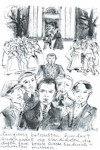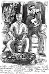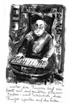 Rock, der ihm bis an die Knie reicht. Durch eine Drahtbrille mit dicken